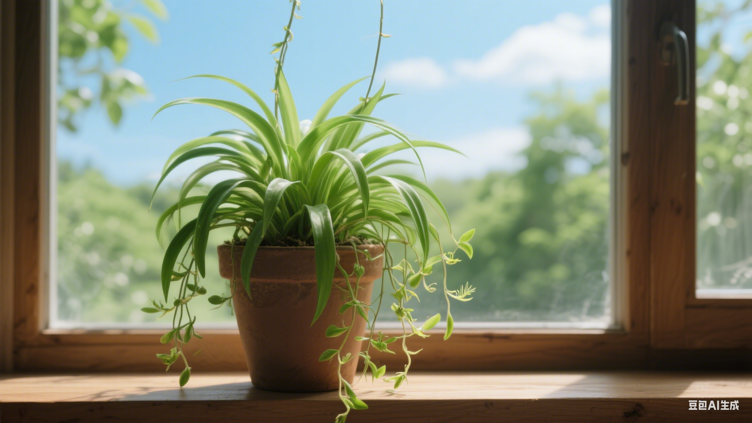 吊蘭 不知什么時候,臥室窗下的那盆吊蘭中,悄然綻放了一朵小花兒。花朵不大,小巧玲瓏,一角硬幣大小。仔細看去,六個潔白如玉的花瓣,形狀卻有兩種:一種橢圓,一種細長。兩種形狀的花瓣間次排列,圍成一個小小的花朵。陽光下,花瓣邊緣閃著淡淡的銀光。花瓣的尖端微微上翹,宛如芭蕾舞者踮起的腳尖,優雅而俏皮。花朵的中央,立著幾條細長的黃色花蕊,猶如仙子眼中的星光,明亮而耀眼。輕輕靠近,一股淡雅而清新的香味撲鼻而來,令人心曠神怡。盆中的那些綠葉,像是忠誠的侍衛,默默地守護著這位美麗的白衣仙子,頗有“萬綠叢中一點白”的意味。窗外一陣微風吹來,白色的小花在綠葉叢中輕輕搖曳,似在翩翩起舞,又似在向我微笑致意。